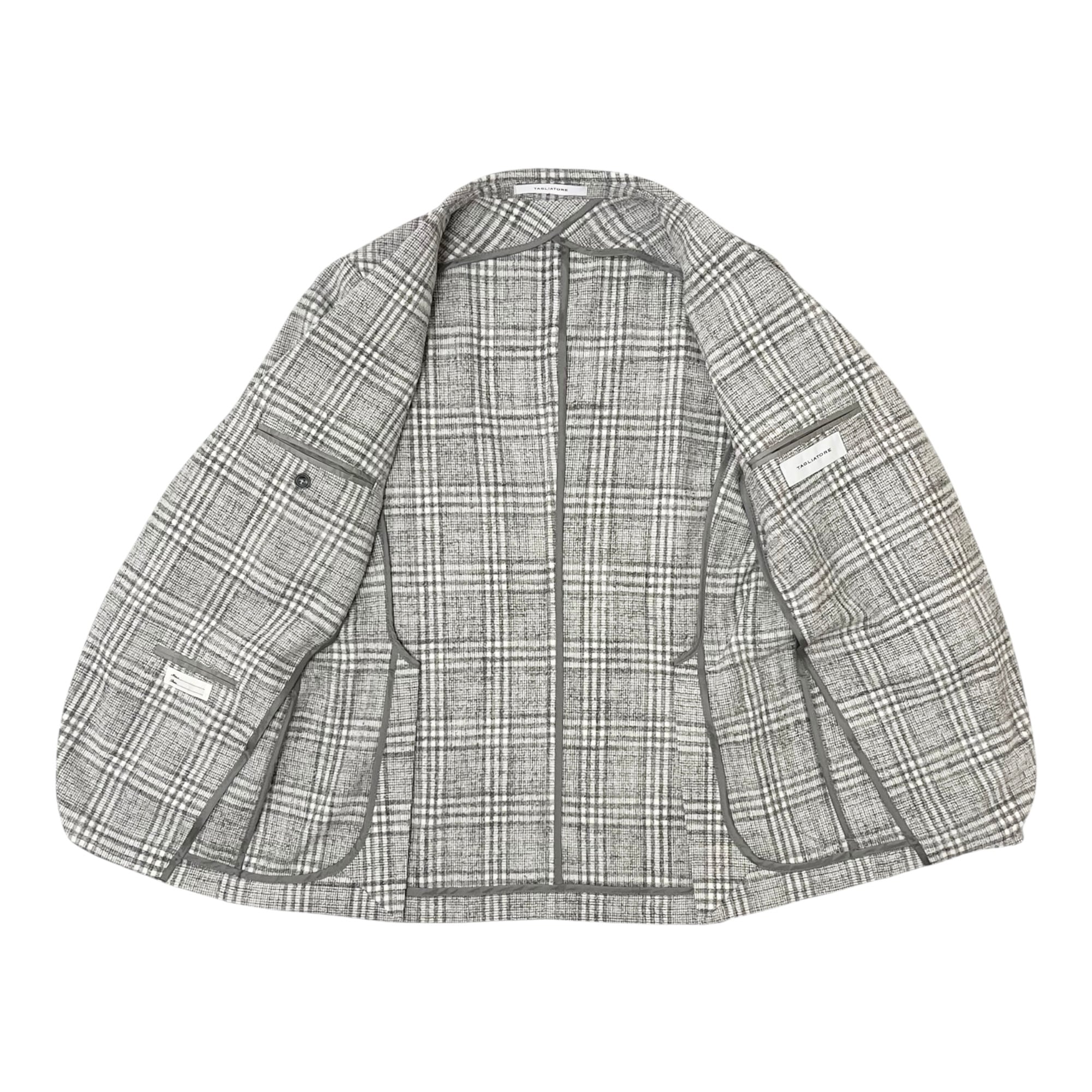 アルパカがベースのウォーム感のある生地にホワイト×グレーのグレンプレイド柄がリュックスな大人のジャケットに仕上がっております。
