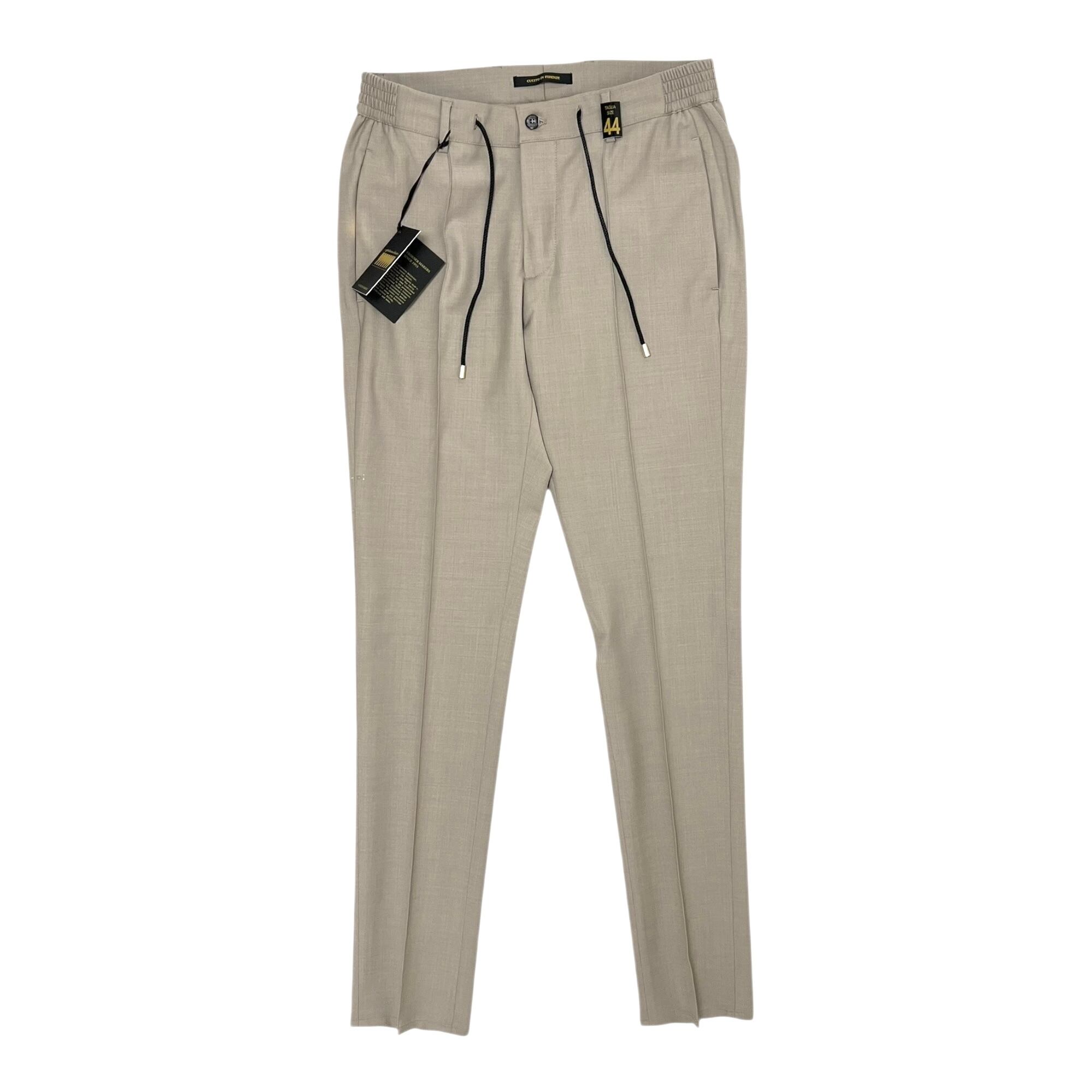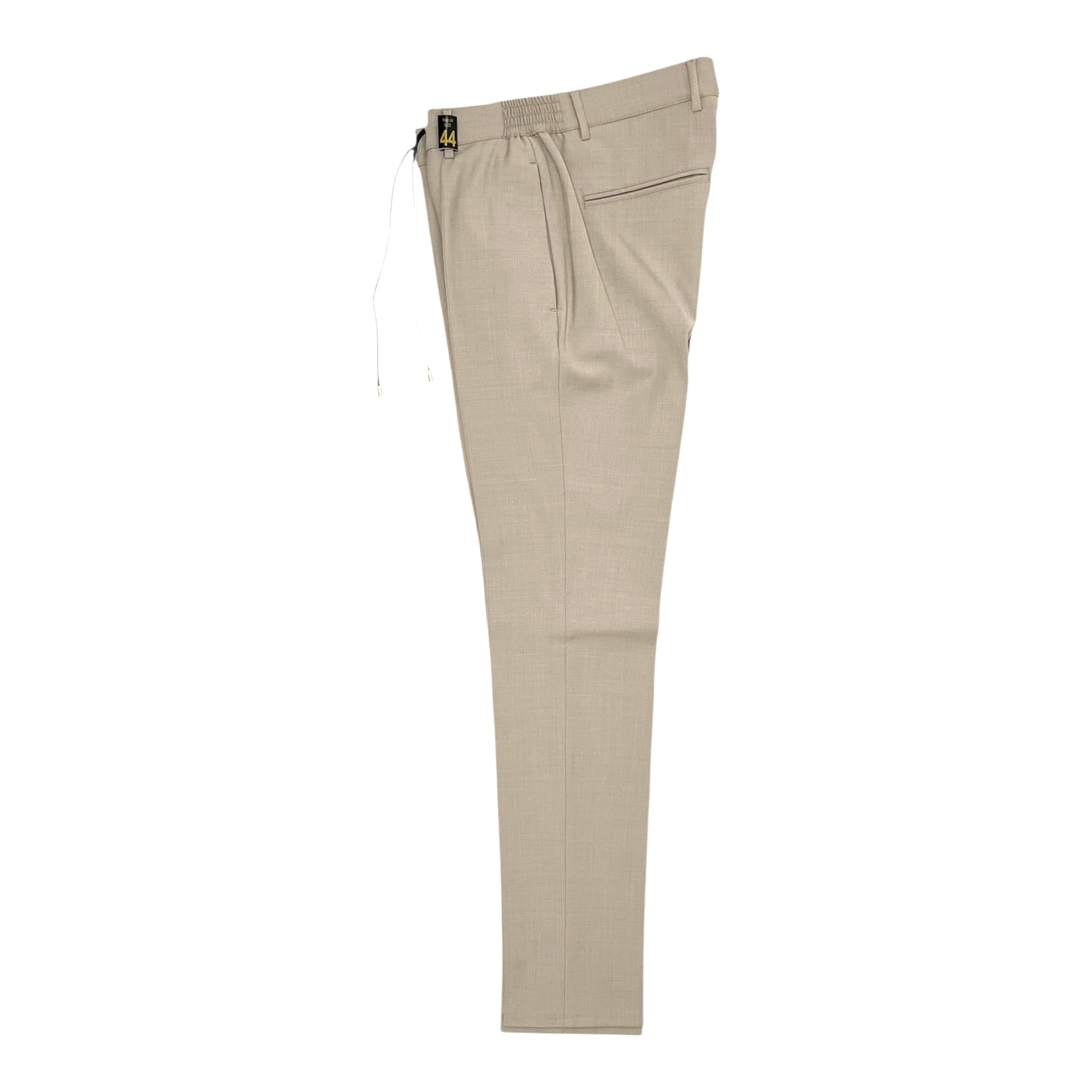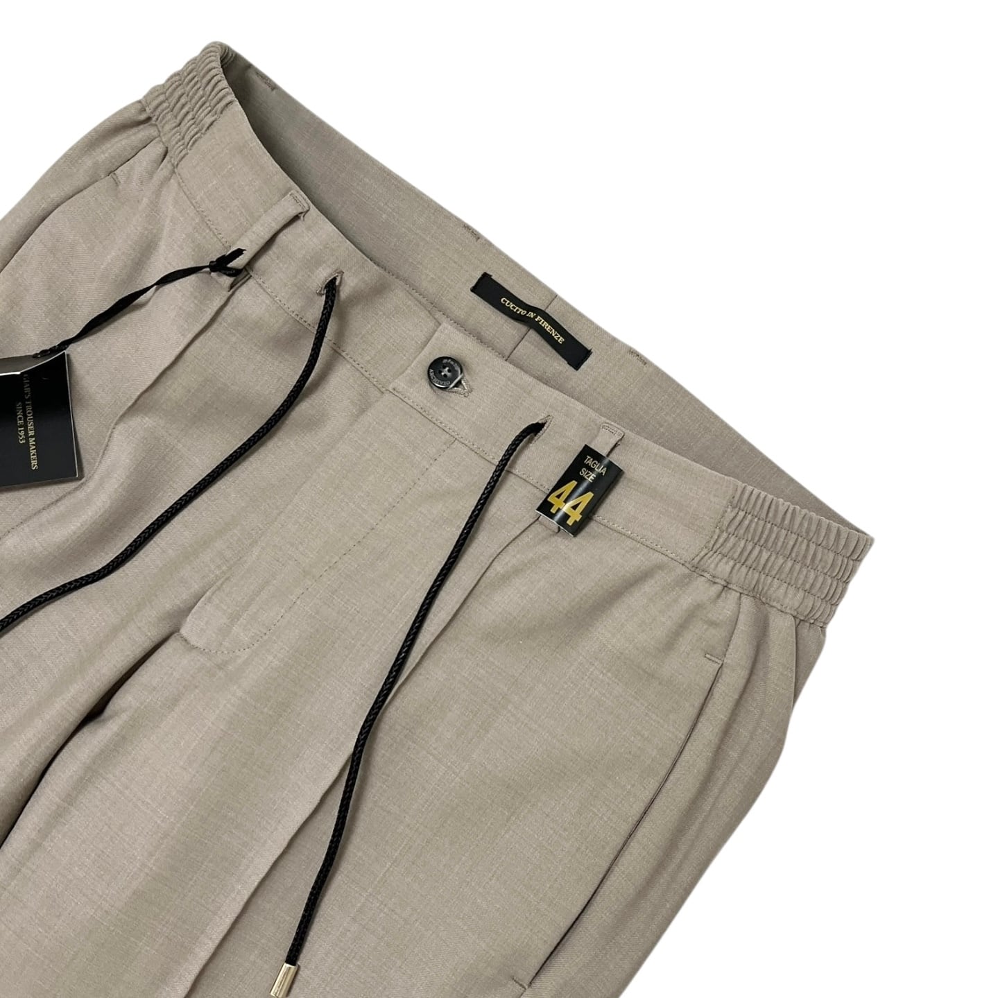 ゴールドパーツがアクセントとなったウエストドローコード、両サイドのゴムシャーリングによる快適な穿き心地、脚を綺麗に見せるジャブスアルキヴィオならではの細身のシルエット、革靴、スニーカーのどちらにもフィットするユーティリティーリラックストラウザーズ。脚長効果のあるひざ上からのテーパードシルエットが魅力。