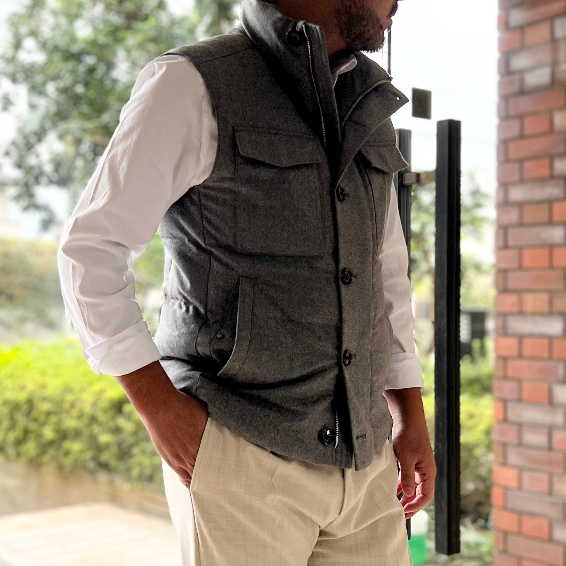 表地にはVITALE BARBERIS CANONICOの上質なウールフランネルを使用しておりカジュアルアイテムでもあるダウンベストも高級感溢れる大人のためのアイテムに仕上がっております。