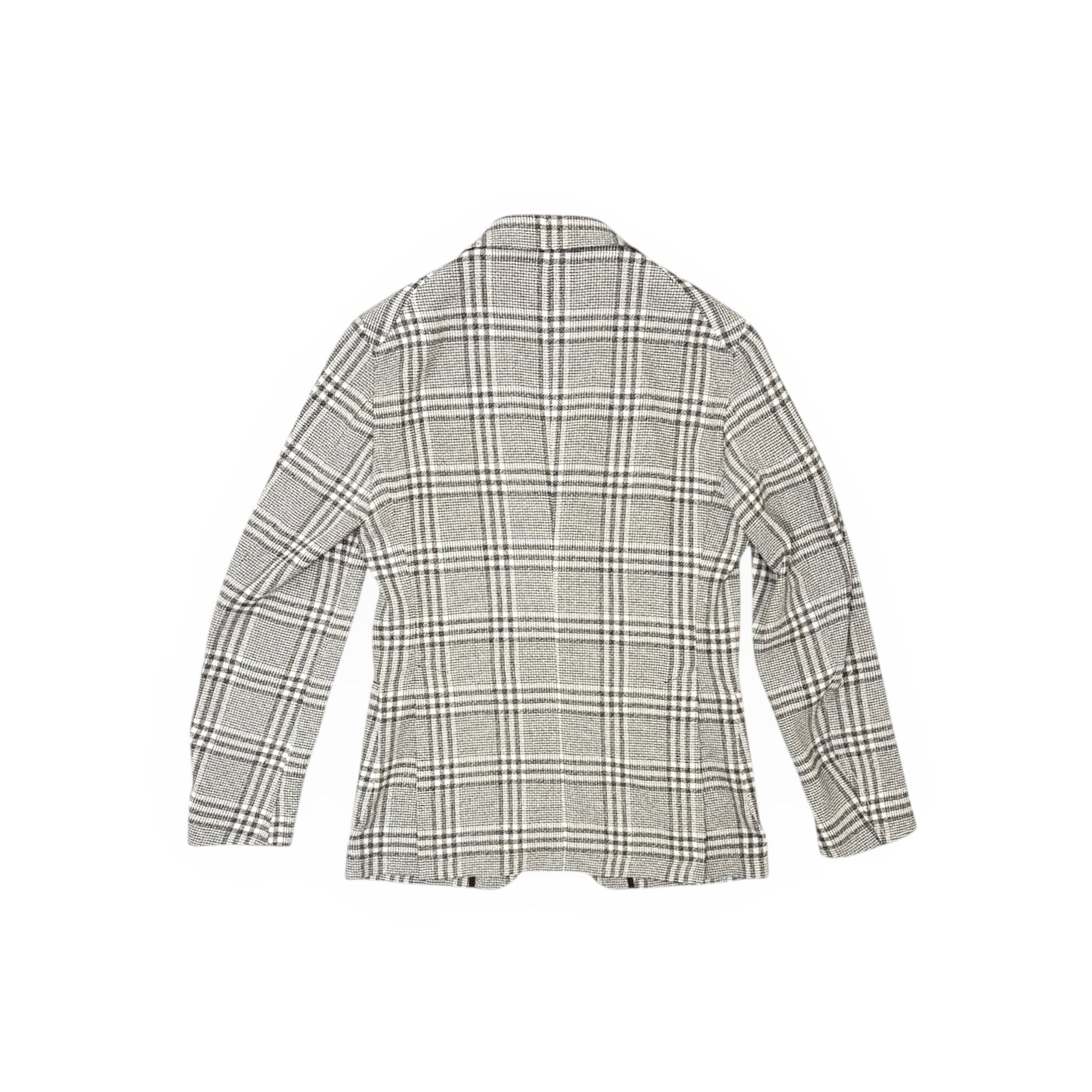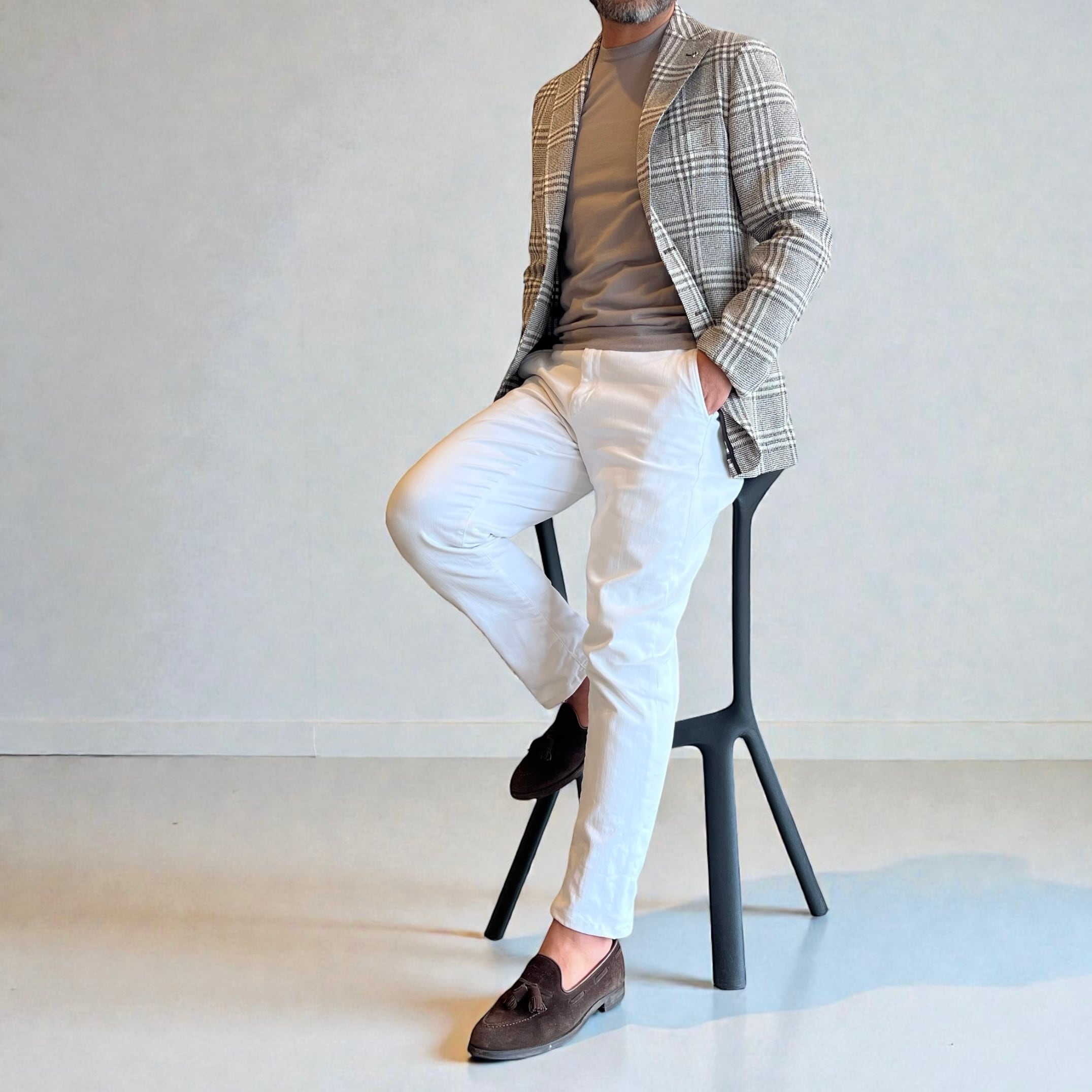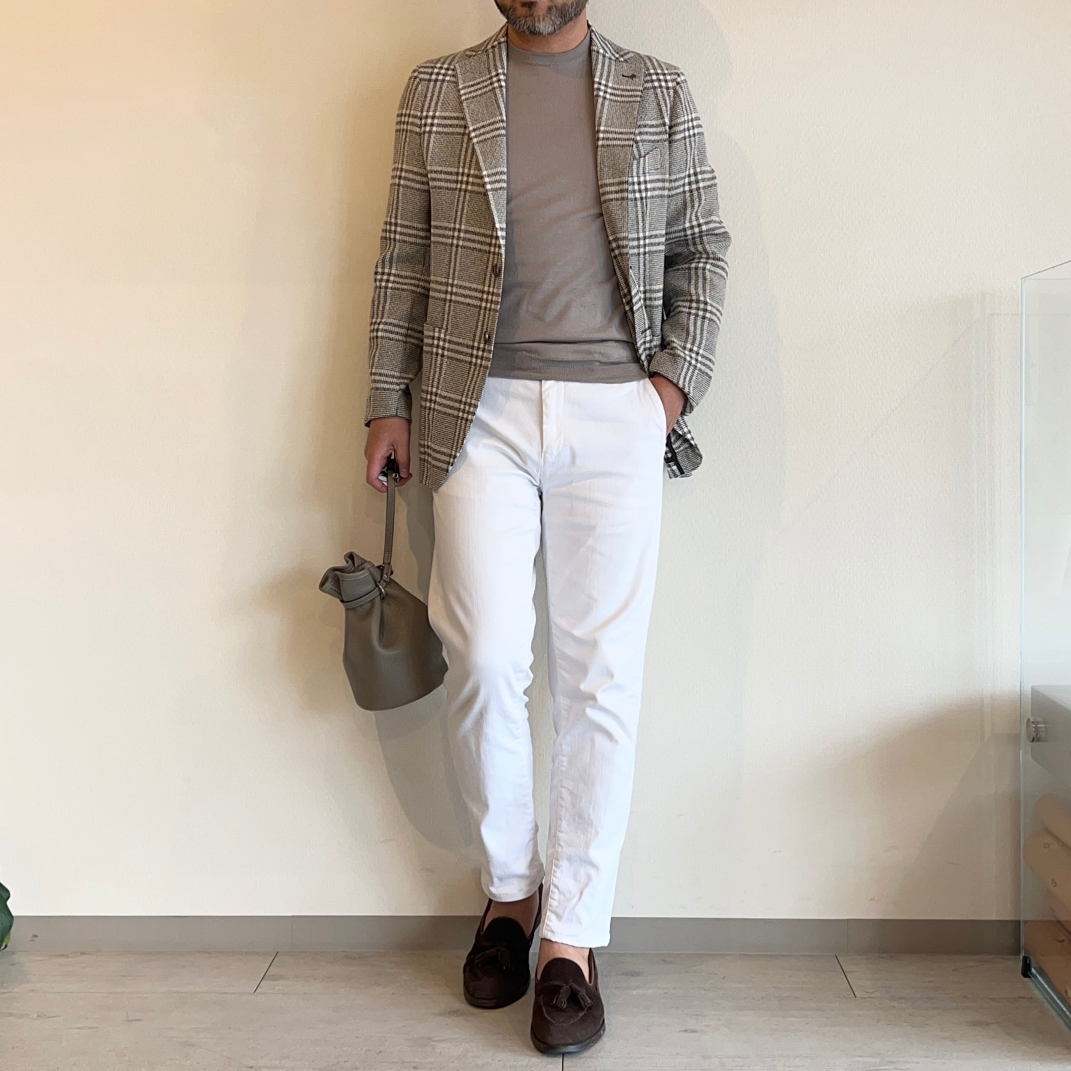 コットンがベースの清涼感のある生地にホワイト×ブラウンのグレンプレイド柄がリュックスな大人のジャケットに仕上がっております。