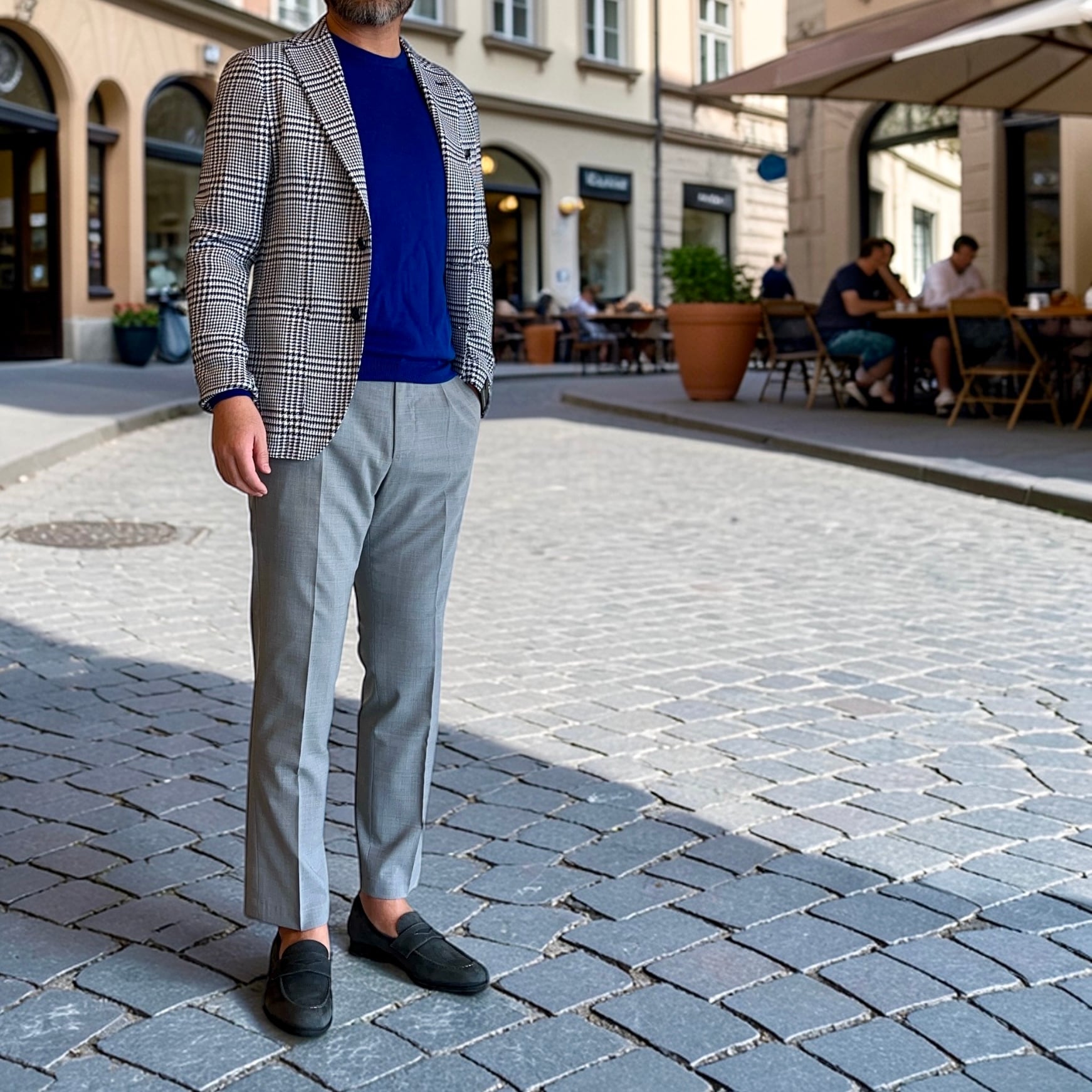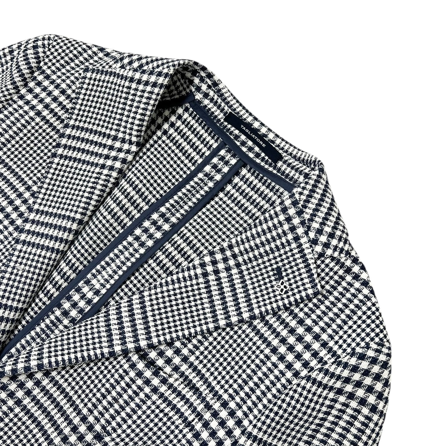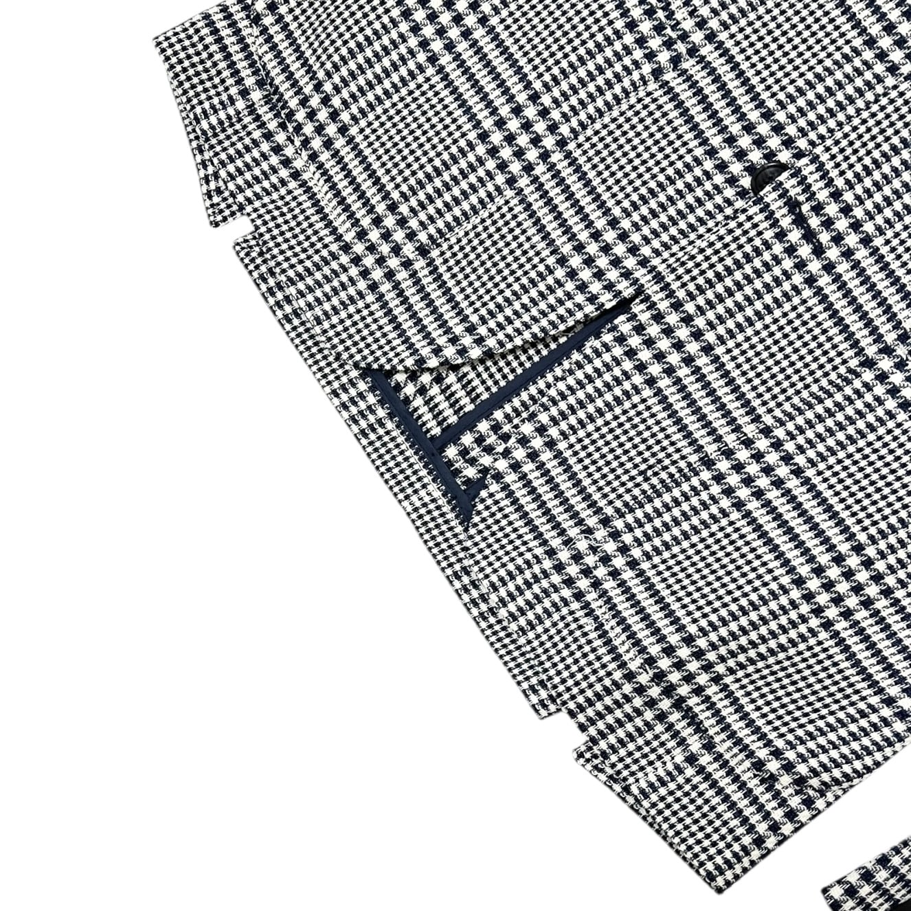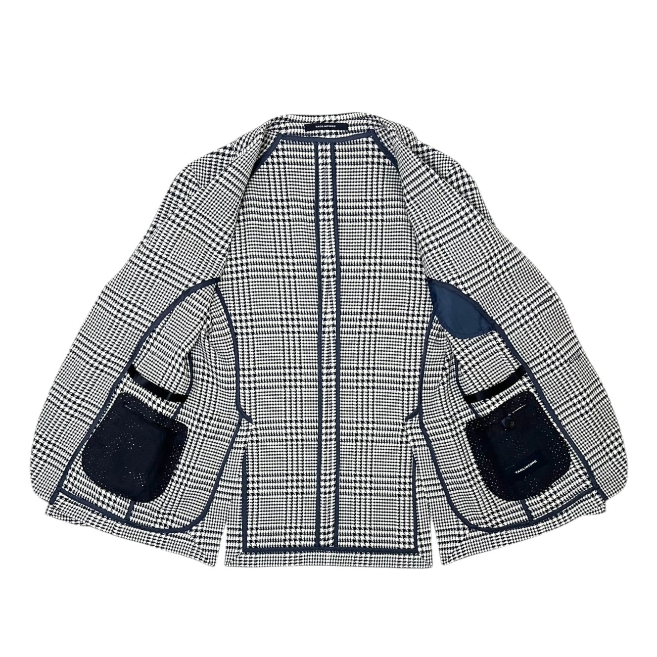 コットンがベースの清涼感のある生地にホワイト×ネイビーのグレンプレイド柄がリュックスな大人のジャケットに仕上がっております。