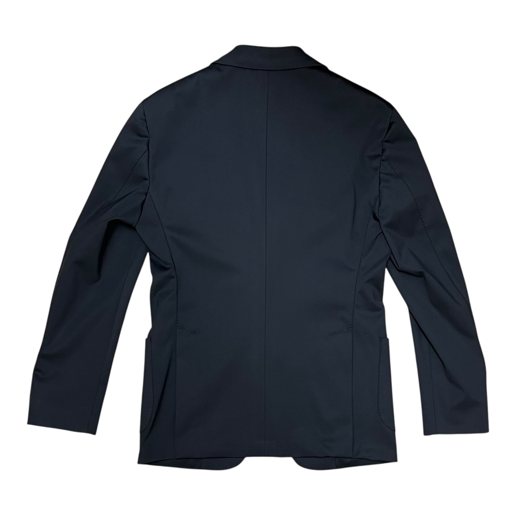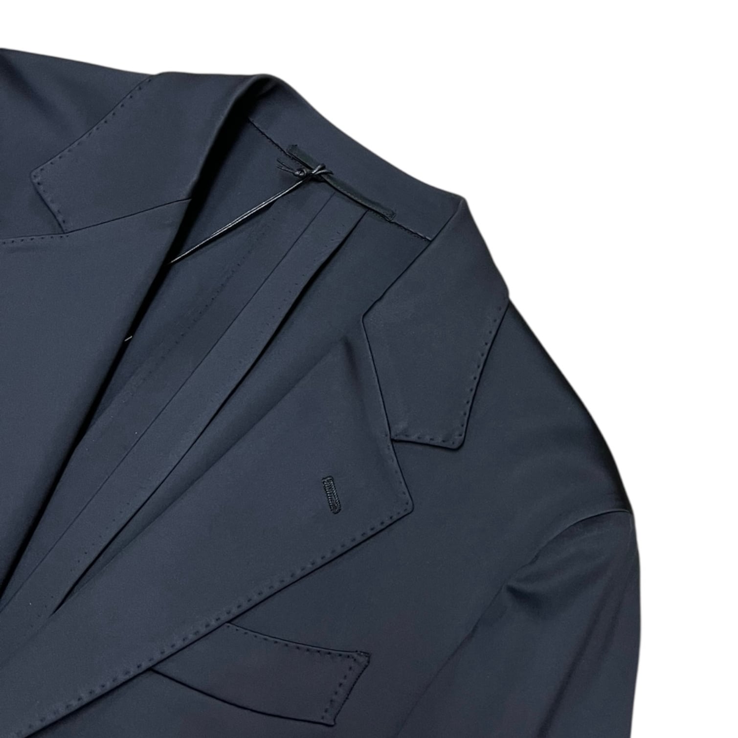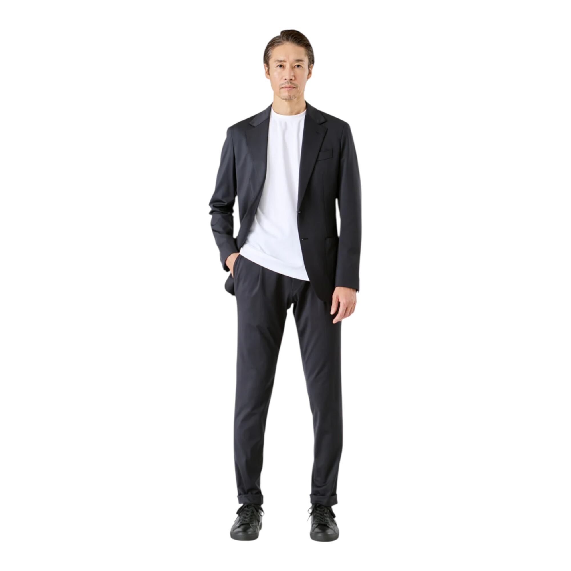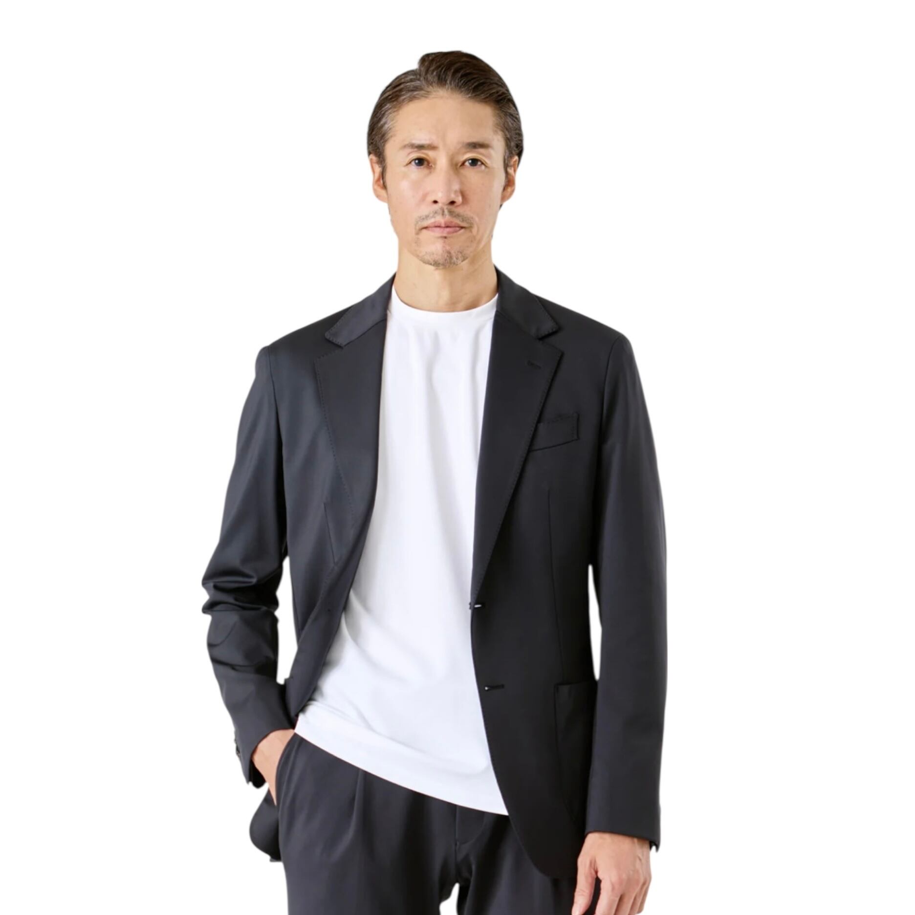 合繊ニット素材では難しい構築的な立体感や衿とラペルのシャープな返りを完璧に表現、着やすさと美しさの両立を実現しています。