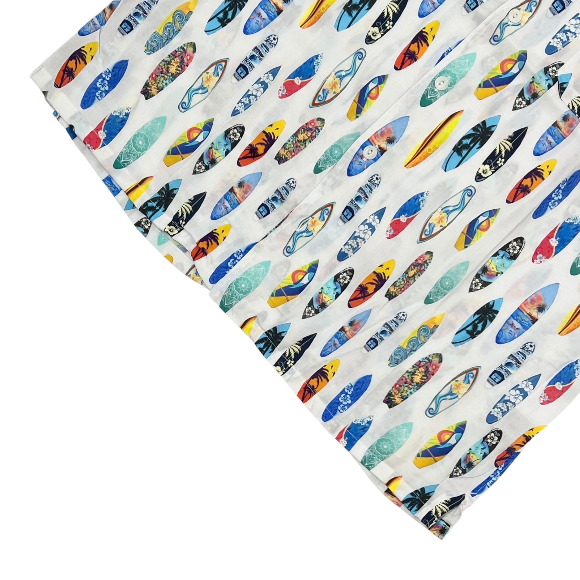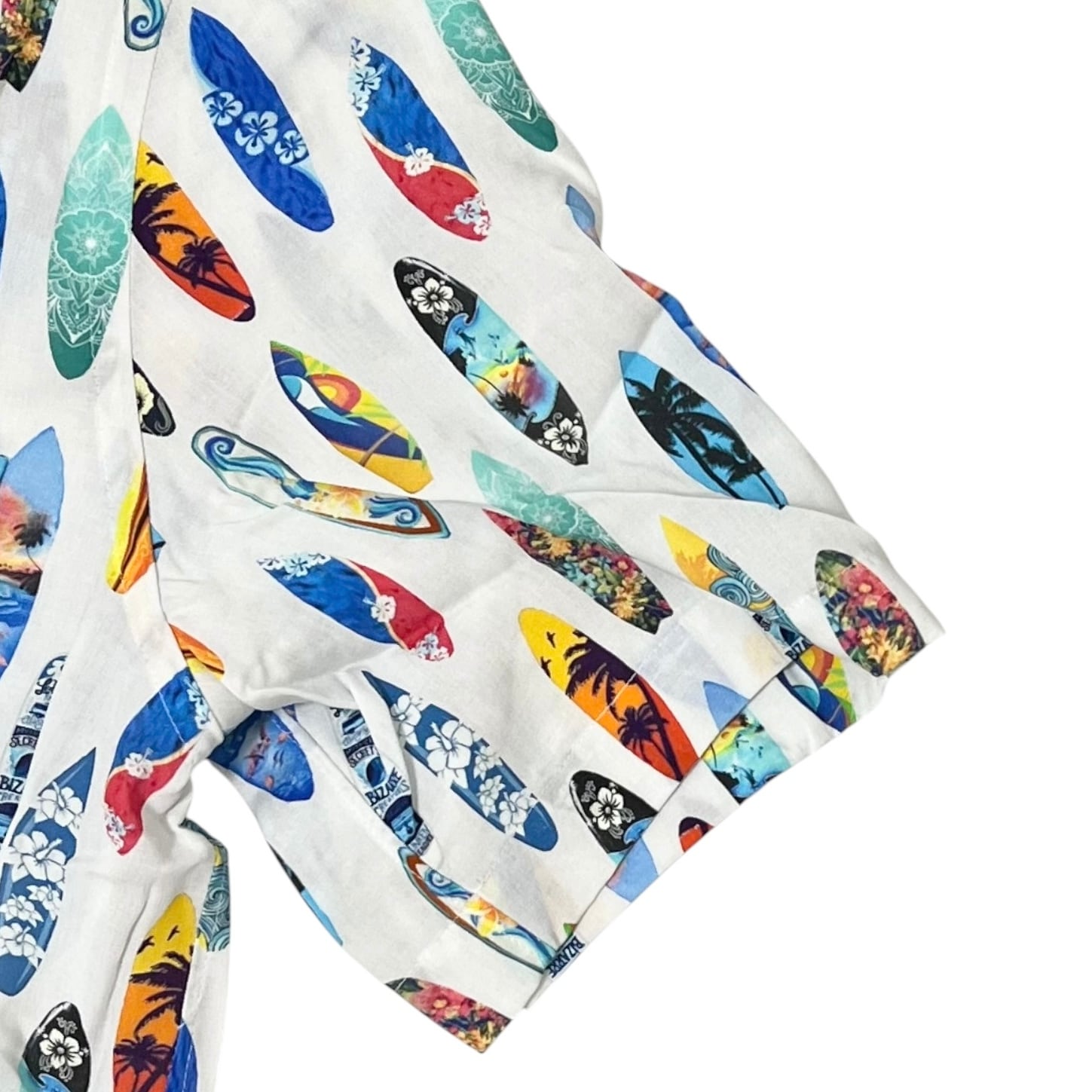 様々なサーフボードをプリントした半袖開襟シャツです。